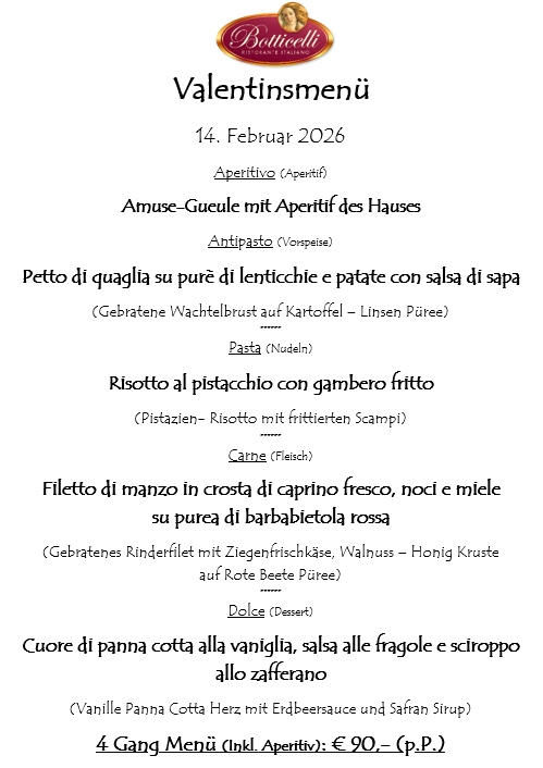 Wie jedes Jahr präsentieren wir auch diesmal wieder für alle Verliebten ein ganz besonderes 4-Gänge-Menü inkl. Aperitif zum Preis von 90 Euro pro Person. Wir empfehlen eine frühzeitige Reservierung.